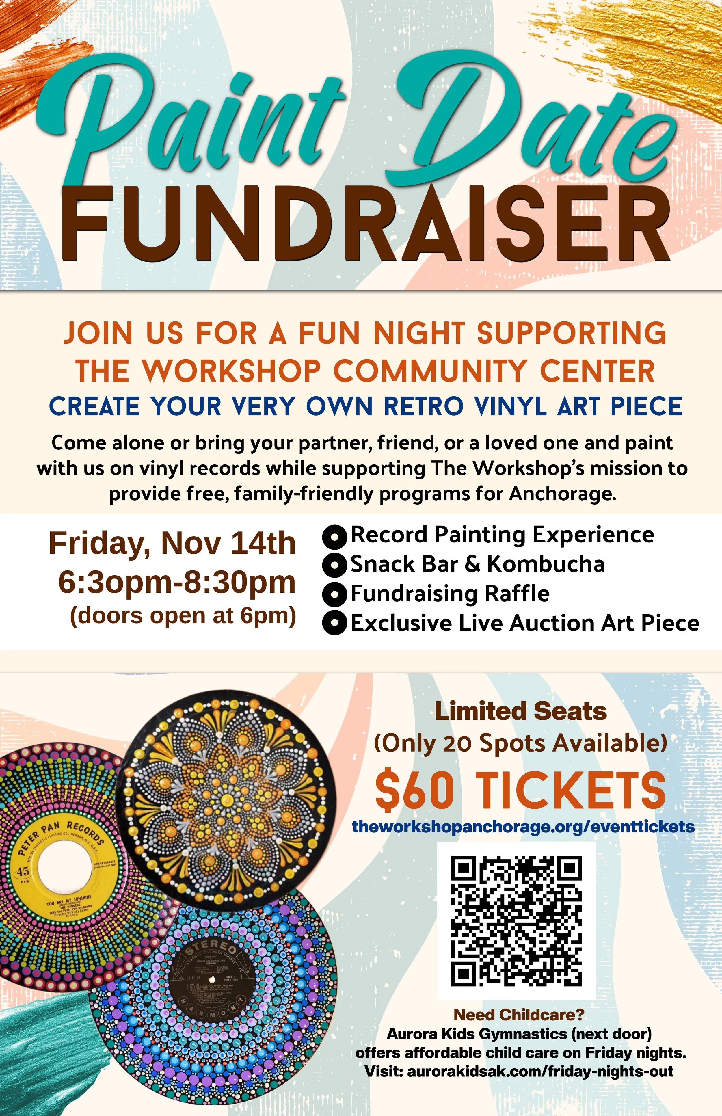 Join us for a creative evening out at The Workshop Community Center for our Date Paint Fundraiser! Bring your partner, friend, or loved one and paint together on vinyl records while supporting The Workshop’s mission to provide free, family-friendly programs for Anchorage.