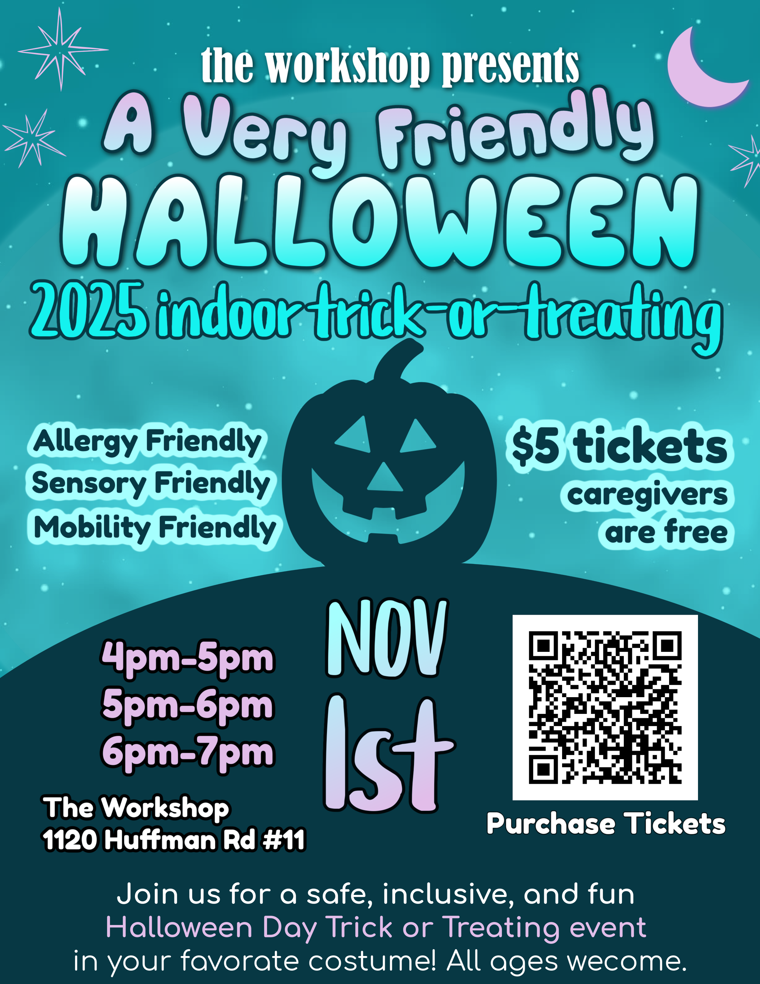 🎃 Join us for a Very Friendly Halloween at The Workshop Community Center on Saturday, November 1st during one of our three time slots! 🎃